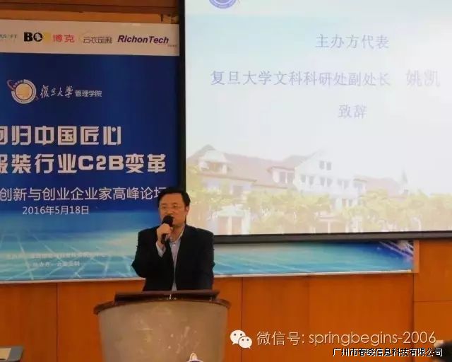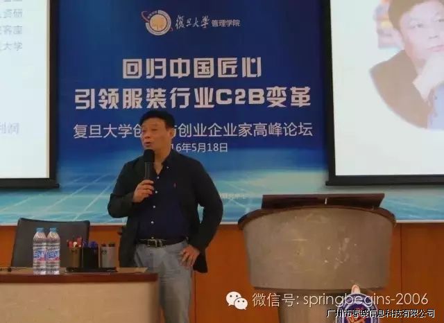 5月18日下午13:00,万众期待的“引领服装行业C2B变革,创新与创业企业家高峰论坛”在复旦大学管理学院如期召开并于下午17:30完美落幕,本次论坛由复旦大学管理学院主办、广州VSport-胜利信息科技有限公司协助举办,会场内座无虚席,200余人到场参会。论坛邀请了多位资深学者、成功企业家等重磅嘉宾纯干货主题演讲,受到广泛好评,会议进行中掌声持续响起。