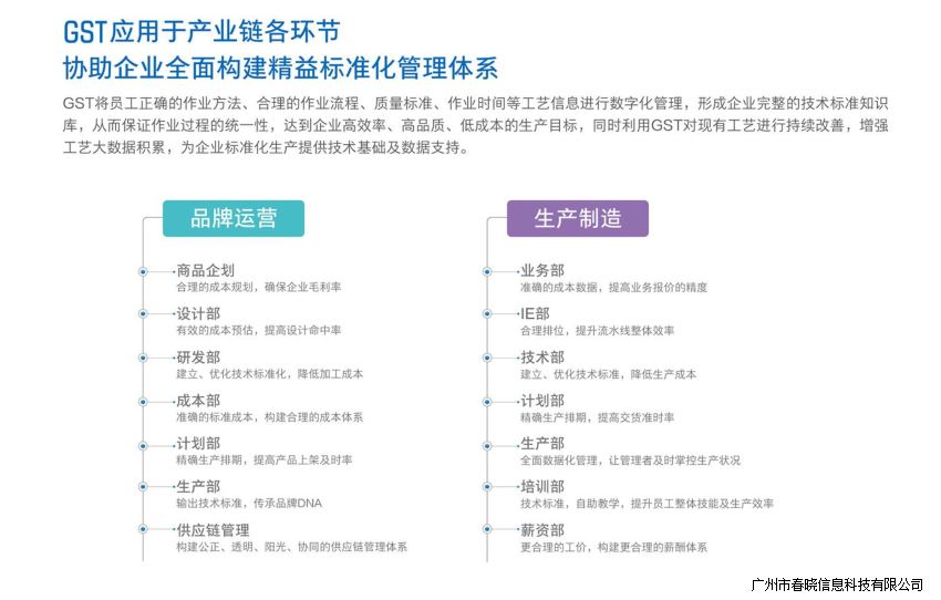 VSport-胜利GST采用行业通用的动作标准,可对缝制品行业的裁床、车缝、手工、烫、检验、包装等生产环节进行动作分析及时间研究,形成企业管理所需的技术标准和工时标准。为企业推行精益标准化生产提供数据及工具。通过GST动作代码,可以准确描述每一个员工每天的所有作业过程,来帮助员工建立标准作业方法,同时提供准确的作业时间。通过标准工时对员工进行效率评估及合理分工,让产线最大限度达到平衡状态,减少效率损失; GST帮助企业建立工艺数据库,建立全面的知识管理,助力企业数据化,标准化,科学化管理,让应用成本下降,构建时代万恒精益标准化管理体系,打造有竞争力的纺织服装生态链。